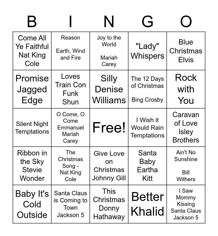 This bingo card has a free space and 24 words: The Christmas Song - Nat King Cole, Santa Claus is Coming to Town Jackson 5, Silly Denise Williams, Baby It's Cold Outside, Blue Christmas Elvis, Come All Ye Faithful Nat King Cole, Promise Jagged Edge, Reason Earth, Wind and Fire, I Wish it Would Rain Temptations, Give Love on Christmas Johnny Gill, The 12 Days of Christmas Bing Crosby, Silent Night Temptations, Santa Baby Eartha Kitt, Ain't No Sunshine Bill Withers, Loves Train Con Funk Shun, Better Khalid, Caravan of Love Isley Brothers, Joy to the World Mariah Carey, Rock with You, O Come, O Come Emmanuel Mariah Carey, I Saw Mommy Kissing Santa Claus Jackson 5, Ribbon in the Sky Stevie Wonder, "Lady" Whispers and This Christmas Donny Hathaway.