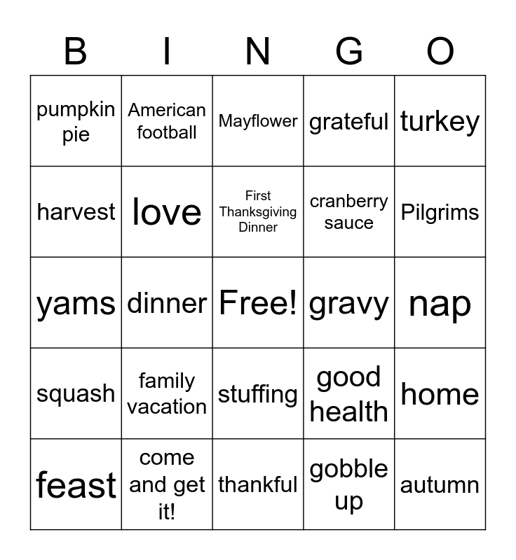 This bingo card has a free space and 24 words: family vacation, come and get it!, First Thanksgiving Dinner, feast, turkey, pumpkin pie, harvest, American football, gravy, stuffing, cranberry sauce, yams, good health, home, love, gobble up, nap, Mayflower, Pilgrims, dinner, autumn, squash, grateful and thankful.