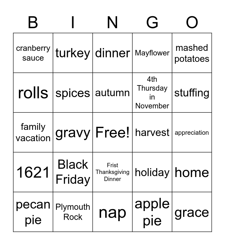 This bingo card has a free space and 25 words: Black Friday, nap, autumn, pecan pie, mashed potatoes, cranberry sauce, rolls, turkey, harvest, Frist Thanksgiving Dinner, 4th Thursday in November, family vacation, holiday, home, spices, thankful, appreciation, dinner, stuffing, gravy, grace, Plymouth Rock, 1621, Mayflower and apple pie.