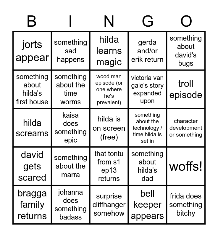 This bingo card has a free space and 24 words: something about the marra, johanna does something badass, wood man episode (or one where he's prevalent), bragga family returns, something about david's bugs, jorts appear, something about hilda's first house, something sad happens, something about the technology / time hilda is set in, that tontu from s1 ep13 returns, victoria van gale's story expanded upon, hilda screams, something about hilda's dad, woffs!, something about the time worms, bell keeper appears, character development or something, hilda learns magic, troll episode, kaisa does something epic, frida does something bitchy, david gets scared, gerda and/or erik return and surprise cliffhanger somehow.