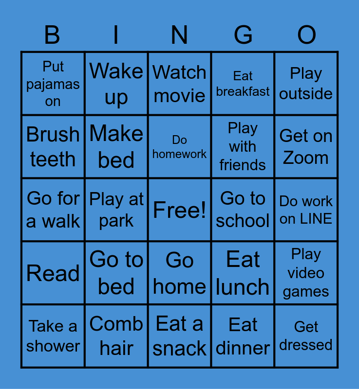 This bingo card has a free space and 24 words: Go to bed, Comb hair, Do homework, Take a shower, Play outside, Put pajamas on, Brush teeth, Wake up, Go to school, Go home, Play with friends, Go for a walk, Eat lunch, Play video games, Make bed, Eat dinner, Do work on LINE, Watch movie, Get on Zoom, Play at park, Get dressed, Read, Eat breakfast and Eat a snack.
