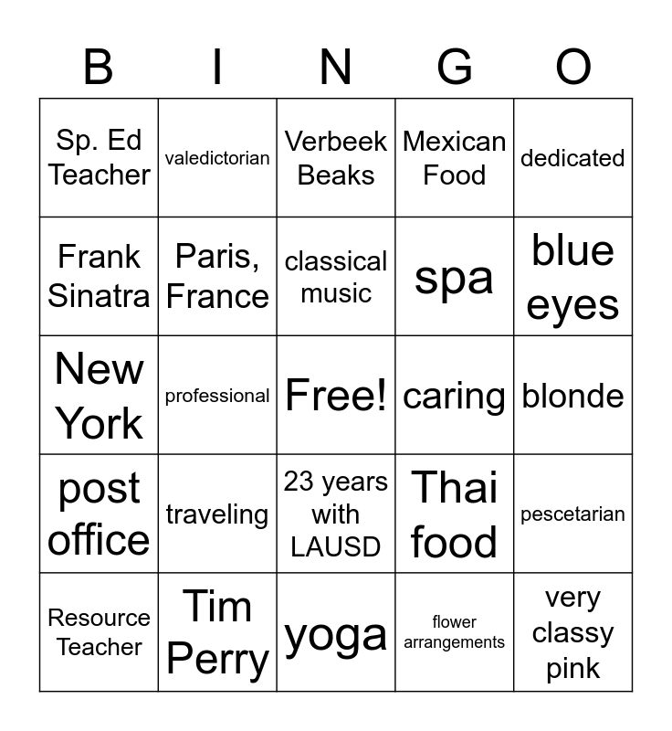 This bingo card has a free space and 27 words: Thai food, November, spa, yoga, Frank Sinatra, Verbeek Beaks, valedictorian, post office, caring, pescetarian, New York, Mexican Food, Resource Teacher, Tim Perry, blue eyes, Master in Sp. Ed, Paris, France, classical music, traveling, Sp. Ed Teacher, blonde, flower arrangements, professional, very classy pink, 23 years with LAUSD, dedicated and welcoming and friendly.