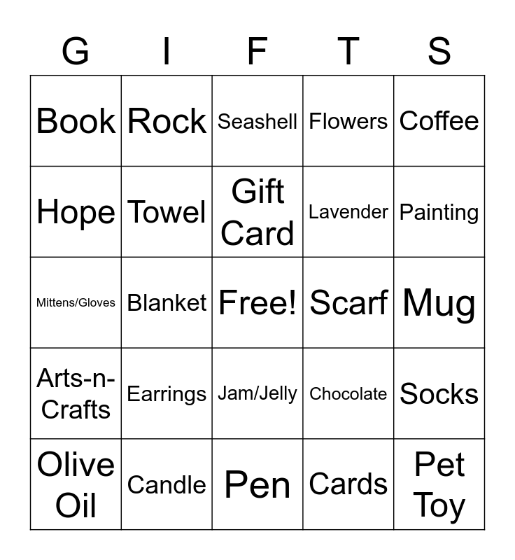 This bingo card has a free space and 24 words: Earrings, Candle, Gift Card, Olive Oil, Coffee, Book, Hope, Rock, Scarf, Jam/Jelly, Lavender, Mittens/Gloves, Chocolate, Socks, Towel, Cards, Mug, Seashell, Painting, Blanket, Pet Toy, Arts-n-Crafts, Flowers and Pen.
