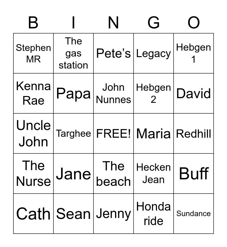 This bingo card has a free space and 38 words: Dia, Poo, Mere Mere, Papa, Buff, Jane, John Nunnes, Sheldon, Hebgen 1, Hebgen 2, Targhee, Legacy, Sundance, Redhill, Kenna Rae, The Nurse, John Ivins, Pete’s, Ninny, Maria, Stephen MR, Sean, David, Cath, Coco, Jenny, Josh, Roger Merrill, A-Game, The Ho Hum Motel, Bear World, The beach, Honda ride, The gas station, Running Bear (The Runs), Hecken Jean, Uncle John and Aunt Dar.