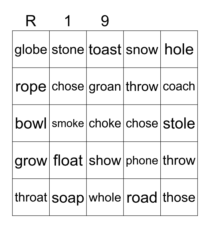 This bingo card has a free space and 24 words: float, soap, groan, throat, hole, globe, rope, stone, chose, show, throw, bowl, phone, throw, chose, road, stole, toast, coach, smoke, those, grow, snow and whole.