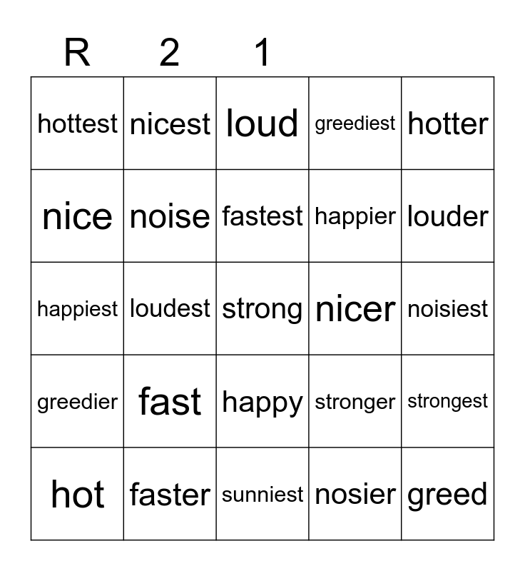This bingo card has a free space and 24 words: fast, faster, fastest, hot, hotter, hottest, nice, nicest, nicer, happy, happier, happiest, stronger, strongest, noise, nosier, noisiest, loud, louder, loudest, greed, greedier, greediest and sunniest.