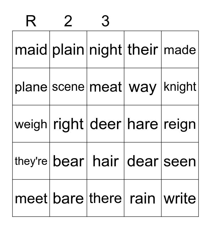 This bingo card has a free space and 24 words: bear, bare, meat, meet, made, maid, plane, plain, hare, hair, way, weigh, dear, seen, scene, rain, reign, night, knight, right, write, they're, their and there.