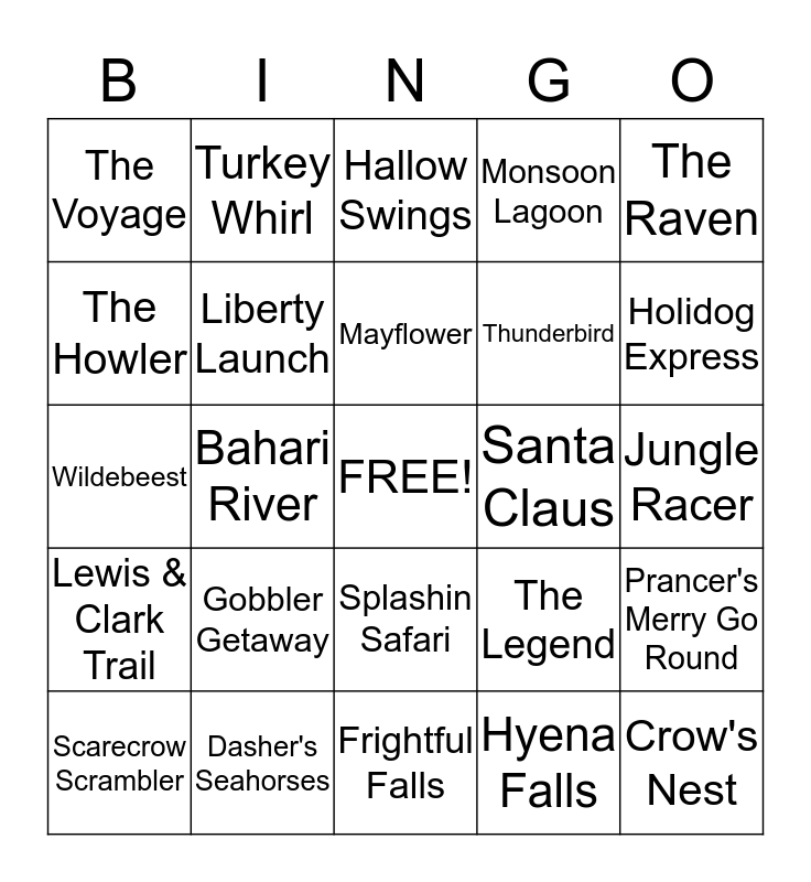 This bingo card has a free space and 24 words: Gobbler Getaway, Dasher's Seahorses, Mayflower, Scarecrow Scrambler, The Raven, The Voyage, The Howler, Turkey Whirl, Santa Claus, Splashin Safari, Thunderbird, Wildebeest, The Legend, Prancer's Merry Go Round, Liberty Launch, Hyena Falls, Jungle Racer, Hallow Swings, Holidog Express, Bahari River, Crow's Nest, Lewis & Clark Trail, Monsoon Lagoon and Frightful Falls.