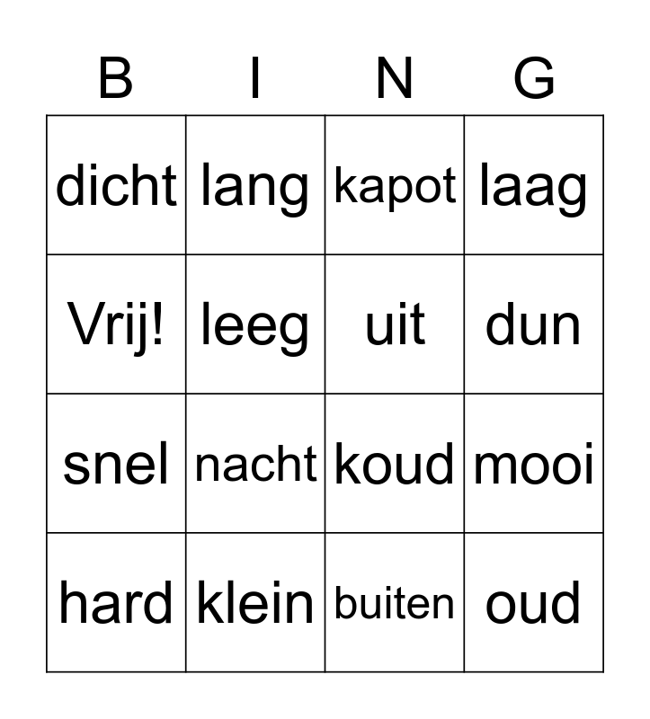 This bingo card has 16 words: klein, mooi, kapot, dicht, snel, lang, koud, buiten, Vrij!, leeg, hard, laag, nacht, dun, uit and oud.