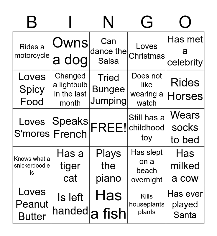 This bingo card has a free space and 24 words: Has a tiger cat, Is left handed, Tried Bungee Jumping, Loves Peanut Butter, Has met a celebrity, Rides a motorcycle, Loves Spicy Food, Owns a dog, Still has a childhood toy, Plays the piano, Does not like wearing a watch, Loves S'mores, Has slept on a beach overnight, Has milked a cow, Changed a lightbulb in the last month, Kills houseplants plants, Wears socks to bed, Can dance the Salsa, Rides Horses, Speaks French, Has ever played Santa, Knows what a snickerdoodle is, Loves Christmas and Has a fish.