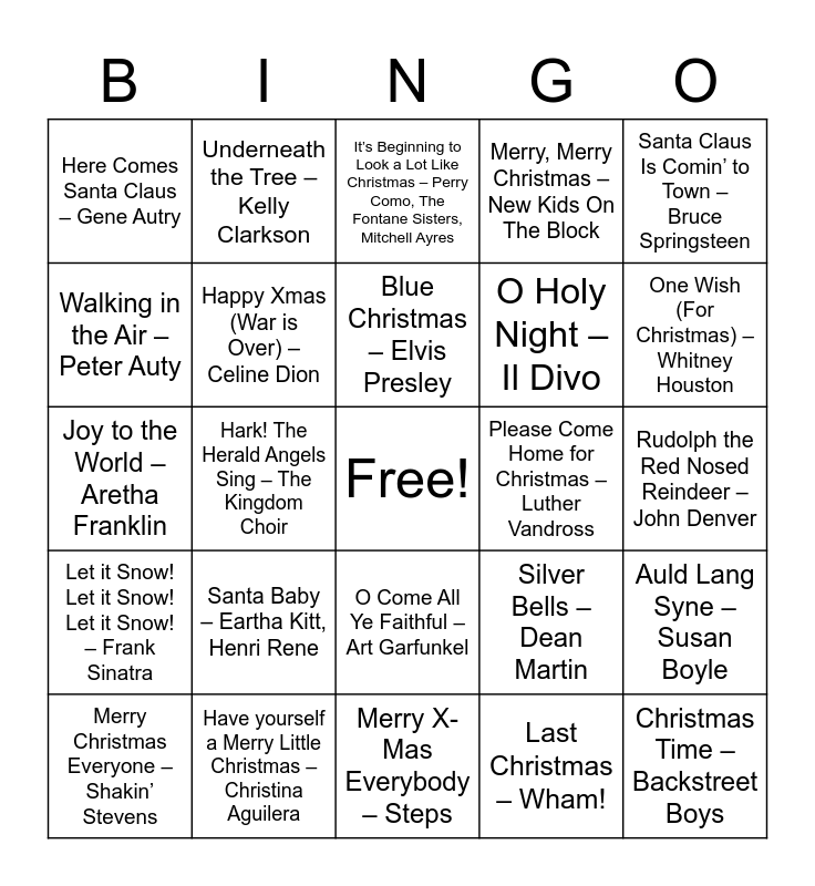 This bingo card has a free space and 34 words: All I want for Christmas is You – Mariah Carey, Last Christmas – Wham!, It’s the Most Wonderful Time of the Year – Andy Williams, Feliz Navidad – Jose Feliciano, Let it Snow! Let it Snow! Let it Snow! – Frank Sinatra, Happy Xmas (War is Over) – Celine Dion, Santa Claus Is Comin’ to Town – Bruce Springsteen, Merry Christmas Everyone – Shakin’ Stevens, Underneath the Tree – Kelly Clarkson, Sleigh Ride – The Ronettes, Blue Christmas – Elvis Presley, It’s Beginning to Look a Lot Like Christmas – Perry Como, The Fontane Sisters, Mitchell Ayres, Winter Wonderland – Tony Bennett, White Christmas – Michael Bolton, Please Come Home for Christmas – Luther Vandross, One Wish (For Christmas) – Whitney Houston, Have yourself a Merry Little Christmas – Christina Aguilera, Joy to the World – Aretha Franklin, Santa Baby – Eartha Kitt, Henri Rene, Silver Bells – Dean Martin, O Come All Ye Faithful – Art Garfunkel, I Want a Hippopotamus for Christmas – Gayla Peevey, Here Comes Santa Claus – Gene Autry, Rudolph the Red Nosed Reindeer – John Denver, Merry X-Mas Everybody – Steps, Christmas Time – Backstreet Boys, Merry, Merry Christmas – New Kids On The Block, God Rest Ye, Merry Gentleman – Kenny G, O Holy Night – Il Divo, Walking in the Air – Peter Auty, Silent Night – Only Boys Aloud, Hark! The Herald Angels Sing – The Kingdom Choir, Auld Lang Syne – Susan Boyle and O Come, All Ye Faithful – Eva Cassidy.
