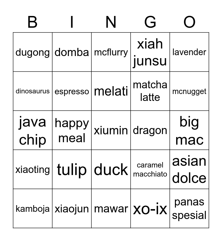 This bingo card has 25 words: tulip, mawar, melati, kamboja, lavender, dugong, dinosaurus, domba, dragon, duck, matcha latte, java chip, caramel macchiato, asian dolce, espresso, panas spesial, big mac, mcflurry, mcnugget, happy meal, xiumin, xiaojun, xiaoting, xiah junsu and xo-ix.