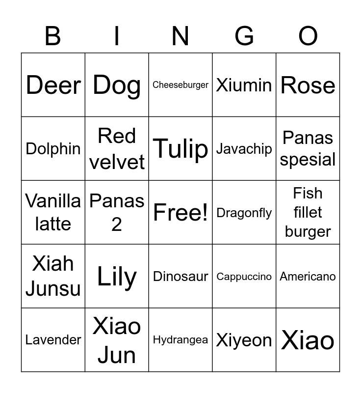 This bingo card has a free space and 25 words: Lily, Hydrangea, Tulip, Lavender, Rose, Deer, Dolphin, Dog, Dragonfly, Dinosaur, Javachip, Vanilla latte, Cappuccino, Americano, Red velvet, Mcflurry, Fish fillet burger, Cheeseburger, Panas spesial, Panas 2, Xiao, Xiao Jun, Xiah Junsu, Xiumin and Xiyeon.