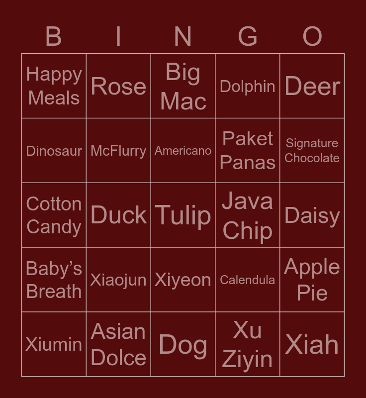 This bingo card has 25 words: Baby’s Breath, Asian Dolce, Tulip, Xu Ziyin, Deer, Happy Meals, Rose, Big Mac, Java Chip, Apple Pie, Dinosaur, McFlurry, Dog, Calendula, Signature Chocolate, Xiumin, Duck, Americano, Paket Panas, Daisy, Cotton Candy, Xiaojun, Xiyeon, Dolphin and Xiah.