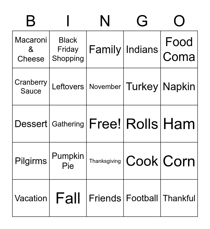 This bingo card has a free space and 24 words: Pumpkin Pie, Fall, November, Vacation, Food Coma, Macaroni & Cheese, Cranberry Sauce, Black Friday Shopping, Rolls, Thanksgiving, Turkey, Dessert, Cook, Corn, Leftovers, Football, Ham, Family, Napkin, Gathering, Thankful, Pilgirms, Indians and Friends.