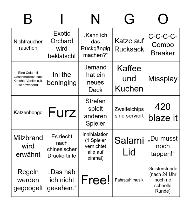 This bingo card has 25 words: Milzbrand wird erwähnt, „Das hab ich nicht gesehen.“, Strefan spielt anderen Spieler, Fahrstuhlmusik, C-C-C-C-Combo Breaker, Nichtraucher rauchen, Exotic Orchard wird beklatscht, „Kann ich das Rückgängig machen?“, Zweifelchips sind serviert, „Du musst noch tappen!“, Eine Cola mit Geschmackszusatz Kirsche, Vanille o.ä. ist anwesend, Ini the beninging, Free!, Salami Lid, Missplay, Regeln werden gegoogelt, Furz, Jemand hat ein neues Deck, Kaffee und Kuchen, 420 blaze it, Katzenbongo, Es riecht nach chinesischer Druckertinte, Innihialation (1 Spieler vernichtet alle auf einmal), Katze auf Rucksack and Geisterstunde (nach 24 Uhr noch ne schnelle Runde).