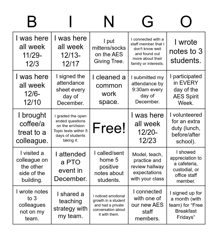This bingo card has a free space and 24 words: I attended a PTO event in December., I shared a teaching strategy with my team., I cleaned a common work space., I wrote notes to 3 colleagues not on my team., I wrote notes to 3 students., I was here all week 11/29-12/3, I was here all week 12/6-12/10, I was here all week 12/13-12/17, I was here all week 12/20-12/23, I called/sent home 5 positive notes about students., I submitted my attendance by 9:30am every day of December., I brought coffee/a treat to a colleague., Model, teach, practice and review hallway expectations with your class, I showed appreciation to a cafeteria, custodial, or office staff member., I signed the attendance sheet every day of December., I connected with one of our new AES staff members., I volunteered for an extra duty (lunch, before/after school)., I put mittens/socks on the AES Giving Tree., I participated in EVERY day of the AES Spirit Week., I graded the open ended questions on the enVision Topic tests within 5 days of students taking it., I signed up for a month (with team) for “Free Breakfast Fridays”, I visited a colleague on the other side of the building., I connected with a staff member that I don't know well and found out more about their family or interests. and I noticed emotional growth in a student and had a private conversation about it with them..