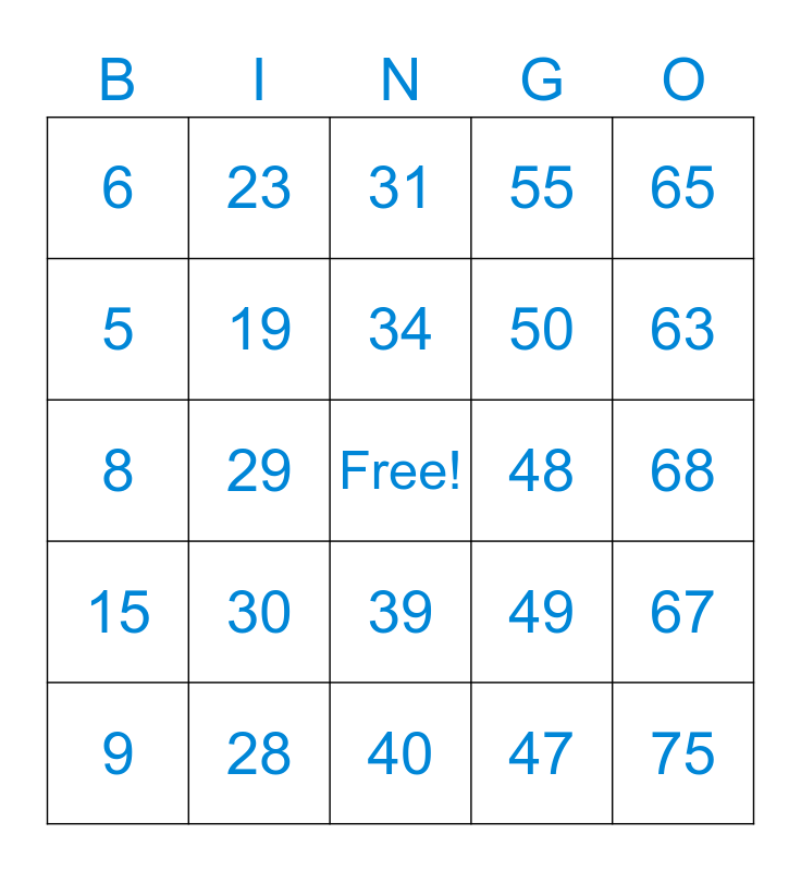 This bingo card has a free space and 75 words: 1, 16, 31, 46, 61, 2, 17, 32, 47, 62, 3, 18, 48, 63, 4, 19, 33, 49, 64, 5, 20, 34, 50, 65, 6, 21, 35, 51, 66, 7, 22, 36, 52, 67, 8, 23, 37, 53, 68, 9, 24, 38, 54, 69, 10, 25, 39, 55, 70, 11, 26, 40, 56, 71, 12, 27, 41, 57, 72, 13, 28, 42, 58, 73, 14, 29, 43, 59, 74, 15, 30, 44, 60, 75 and 45.