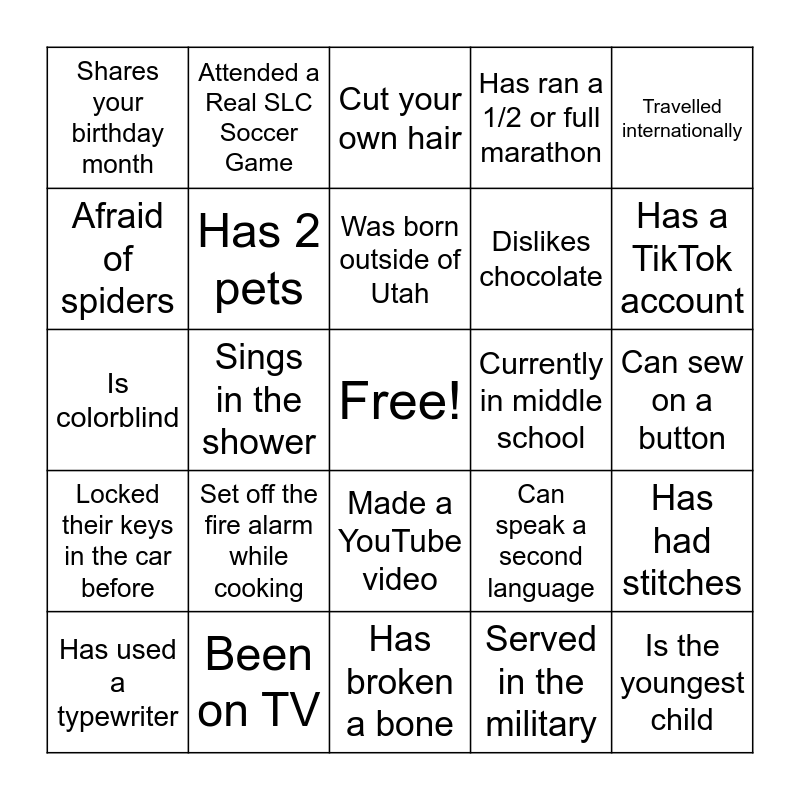 This bingo card has a free space and 30 words: Been on TV, Has not seen the movie Frozen, Sings in the shower, Married 20 years, Shares your birthday month, Cut your own hair, Has 2 pets, Made a YouTube video, Currently in middle school, Has broken a bone, Can sew on a button, Is the youngest child, Served in the military, Owned a blackberry phone, Has a TikTok account, Went to school today, Can speak a second language, Locked their keys in the car before, Set off the fire alarm while cooking, Travelled internationally, Is colorblind, Attended a Major League Baseball Game, Attended a Real SLC Soccer Game, Dislikes chocolate, Afraid of spiders, Has ran a 1/2 or full marathon, Has had stitches, Has used a typewriter, Was born outside of Utah and Has 4 grandkids.