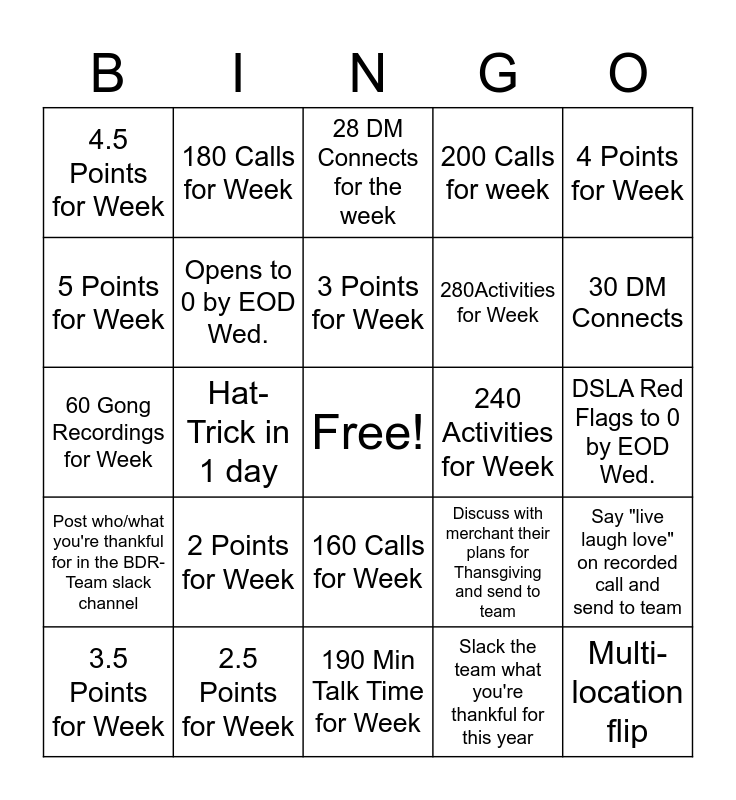 This bingo card has a free space and 24 words: 2 Points for Week, 2.5 Points for Week, 3 Points for Week, 3.5 Points for Week, 4 Points for Week, 4.5 Points for Week, 5 Points for Week, 180 Calls for Week, 240 Activities for Week, 160 Calls for Week, 280Activities for Week, 60 Gong Recordings for Week, Discuss with merchant their plans for Thansgiving and send to team, Say "live laugh love" on recorded call and send to team, Opens to 0 by EOD Wed., Slack the team what you're thankful for this year, DSLA Red Flags to 0 by EOD Wed., 28 DM Connects for the week, 30 DM Connects, Hat-Trick in 1 day, Multi-location flip, Post who/what you're thankful for in the BDR-Team slack channel, 200 Calls for week and 190 Min Talk Time for Week.