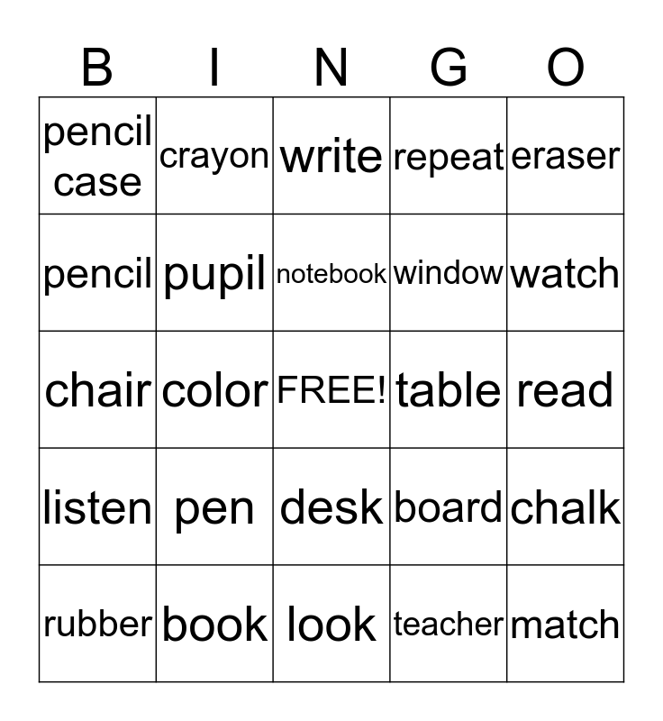 This bingo card has a free space and 24 words: pen, book, notebook, rubber, eraser, pencil case, pencil, crayon, table, desk, window, chair, board, chalk, pupil, teacher, read, write, watch, color, match, listen, repeat and look.