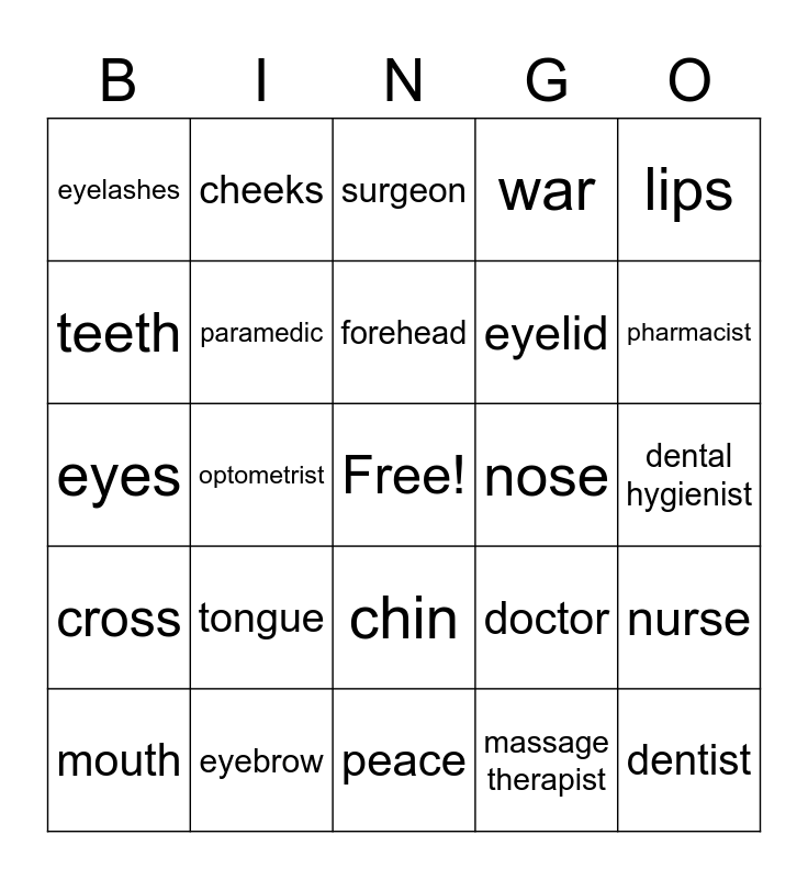 This bingo card has a free space and 24 words: tongue, eyebrow, forehead, mouth, lips, eyelashes, teeth, cheeks, nose, chin, eyelid, eyes, doctor, nurse, paramedic, massage therapist, dental hygienist, surgeon, pharmacist, optometrist, dentist, cross, war and peace.