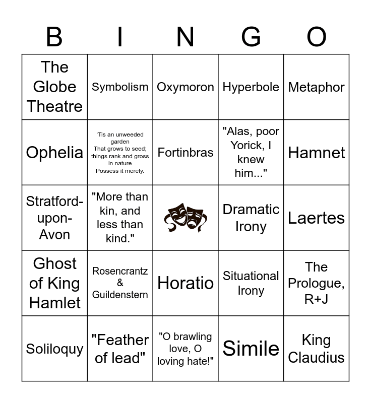 This bingo card has a free space and 37 words: Hamlet, Queen Gertrude, "To be, or not to be, that is the question...", ‘Tis an unweeded garden That grows to seed; things rank and gross in nature Possess it merely., The Prologue, R+J, Rosencrantz & Guildenstern, Fortinbras, Pun, Metaphor, Elsinore, "More than kin, and less than kind.", Hyperbole, King Claudius, Laertes, Ophelia, Ghost of King Hamlet, Polonius, Oxymoron, Horatio, Dramatic Irony, The Globe Theatre, Hamnet, Soliloquy, "O brawling love, O loving hate!", Anne Hathaway, Simile, Symbolism, "Something is rotten in the state of Denmark.", Allusion, MOTIF, 1564, "Feather of lead", Stratford-upon-Avon, Glovemaker, Situational Irony, "Alas, poor Yorick, I knew him..." and Passion v. Reason.