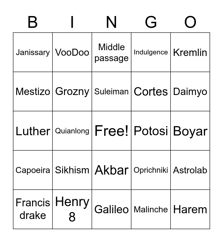 This bingo card has a free space and 28 words: Astrolab, Magellan, Cortes, Malinche, Mestizo, Middle passage, VooDoo, Capoeira, Potosi, Francis drake, Luther, Indulgence, Henry 8, Galileo, Daimyo, Muhgal, Sikhism, Grozny, Suleiman, Akbar, Janissary, Tokugawa, Harem, Quianlong, Boyar, Oprichniki, Kremlin and St. Petersberg.