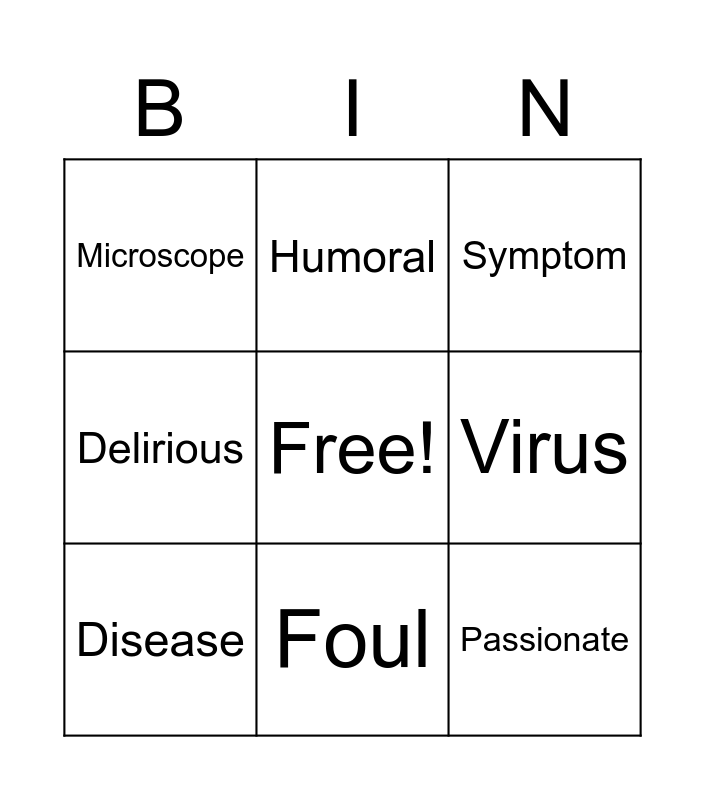 This bingo card has a free space and 17 words: Abruptly, Physician, Symptom, Microscope, Recounted, Delirious, Malignant, Disease, Foul, Virus, Extended, Outspoken, Passionate, Humoral, Theory, Philadelphia and Yellow Fever.