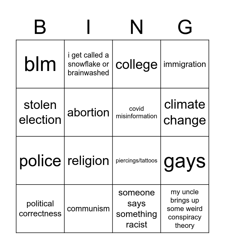 This bingo card has 16 words: communism, gays, college, blm, police, i get called a snowflake or brainwashed, piercings/tattoos, someone says something racist, stolen election, abortion, political correctness, immigration, religion, climate change, covid misinformation and my uncle brings up some weird conspiracy theory.