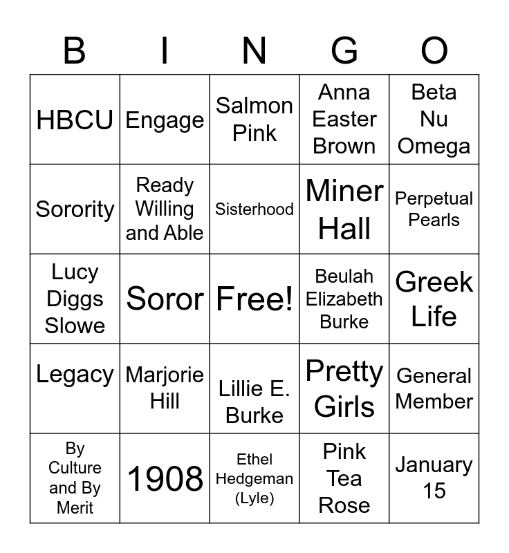 This bingo card has a free space and 45 words: 20 Pearls, January 15, Howard University, By Culture and By Merit, Ivy Leaf, Pink Tea Rose, Salmon Pink, Apple Green, Beta Nu Omega, 1908, Anna Easter Brown, Beulah Elizabeth Burke, Lillie E. Burke, Marjorie Hill, Margaret Flagg (Holmes), Ethel Hedgeman (Lyle), Lavinia Norman, Lucy Diggs Slowe, Marie Woolfolk (Taylor), Perpetual Pearls, Engage, Enlighten, Energize, HBCU, Skee Wee, Greek Life, 1913, Pinkies Up, Pretty Girls, Legacy, Life Member, General Member, NPHC, Founder's Day Celebration, Boule`, Soror, Cluster, Regional Conference, All Man Kind, Sisterhood, Sorority, Miner Hall, Chicago, Ready Willing and Able and 10 Regions.
