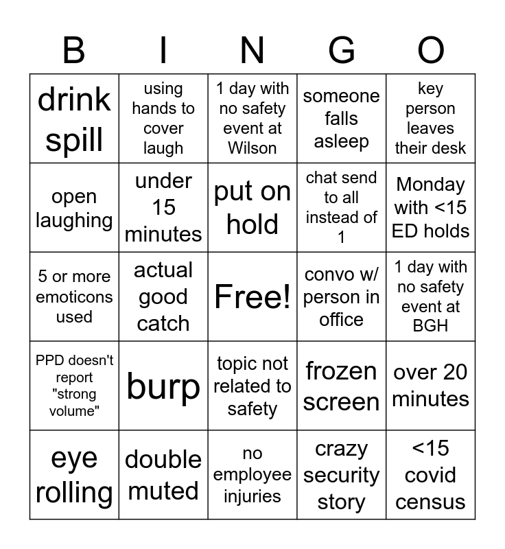 This bingo card has a free space and 24 words: burp, double muted, put on hold, eye rolling, key person leaves their desk, drink spill, open laughing, using hands to cover laugh, convo w/ person in office, topic not related to safety, chat send to all instead of 1, 5 or more emoticons used, frozen screen, over 20 minutes, under 15 minutes, crazy security story, 1 day with no safety event at BGH, 1 day with no safety event at Wilson, Monday with <15 ED holds, actual good catch, <15 covid census, PPD doesn't report "strong volume", someone falls asleep and no employee injuries.