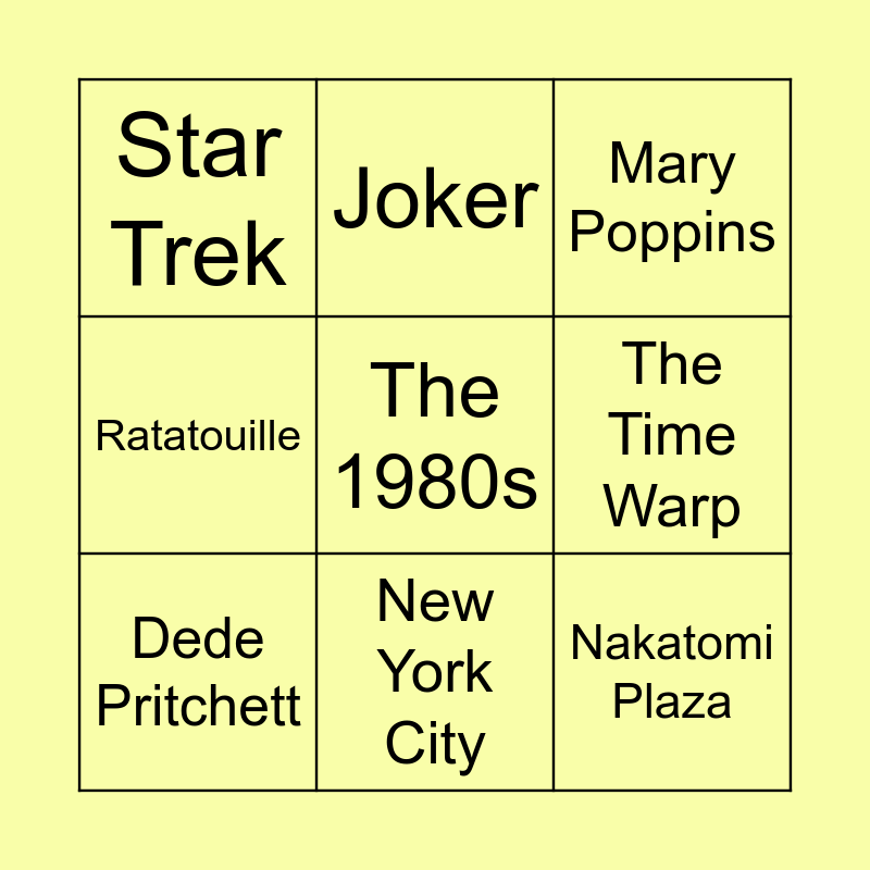 This bingo card has 27 words: Snow White and the Seven Dwarfs, Big, Nakatomi Plaza, Richard Attenborough, The Time Warp, Mary Poppins, Joker, Psycho, Two, Halle Berry, Back to the Future, Ratatouille, Godzilla, Twilight, Charlie and the Chocolate Factory, Avengers: Endgame, Dede Pritchett, New York City, Coronation Street, Star Trek, Jim Parsons, Sydney, Marcel, Bridgeton, 73, The 1980s and Springfield.