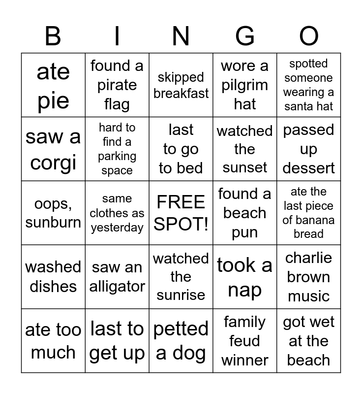 This bingo card has a free space and 24 words: saw an alligator, last to get up, last to go to bed, ate too much, spotted someone wearing a santa hat, ate pie, saw a corgi, found a pirate flag, found a beach pun, watched the sunrise, watched the sunset, oops, sunburn, took a nap, charlie brown music, hard to find a parking space, family feud winner, ate the last piece of banana bread, skipped breakfast, passed up dessert, same clothes as yesterday, got wet at the beach, washed dishes, wore a pilgrim hat and petted a dog.