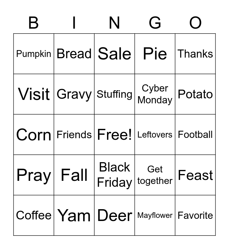 This bingo card has a free space and 80 words: Pie Pumpkin Family, Apple, Sale, Pumpkin, Ship, Cranberry, Happy, Hungry, Family, Coffee, Color, Turkey, Pie, Pumpkin, Family, Visit, Holiday, Fall, Thanksgiving, Football, America, Thanks, Corn, Stuffing, Gravy, Salad, Full (I’m full), Leaves, Color, Parade, Potato, Squirrel, Deer, Bake, Coffee, Leftovers, Nap, Celebrate, Apple, Favorite, Meat, Host, Comfortable, November, Apple Cider, Bread, Butter, Cook, Dessert, Dinner, Feast, Friends, Get together, Harvest, Napkin, Tradition, Vegetables, Bird, Pumpkin pie, Black Friday, Cyber Monday, Sale, Pilgrim, Native American, Snow, Cornucopia, Church, Laugh, Conversation, Hungry, Pray, Yam, Special, Happy, Spoon, Plymouth, Mayflower, Ship, Cranberry and Beans.