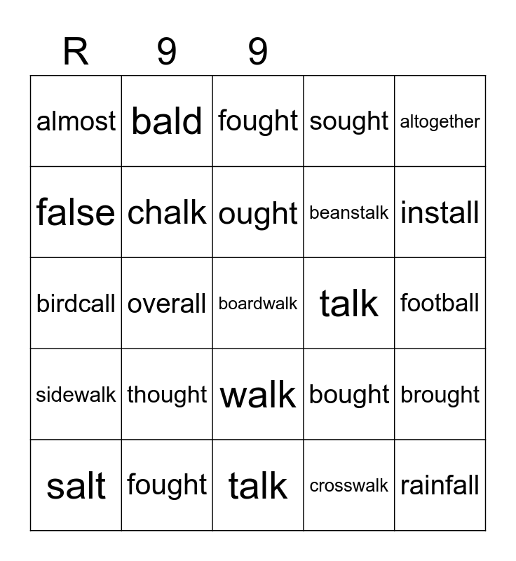 This bingo card has a free space and 24 words: thought, fought, ought, salt, altogether, almost, false, bald, talk, walk, beanstalk, birdcall, bought, brought, chalk, crosswalk, football, fought, install, overall, rainfall, sidewalk, sought and talk.