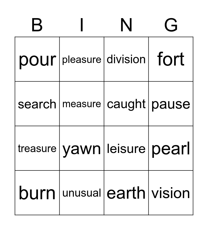 This bingo card has 28 words: television, garage, treasure, beige, measure, division, pleasure, vision, unusual, casual, leisure, fort, paw, orbit, yawn, saw, claw, caught, pause, shore, pour, worm, burn, pearl, earth, learn, search and early.