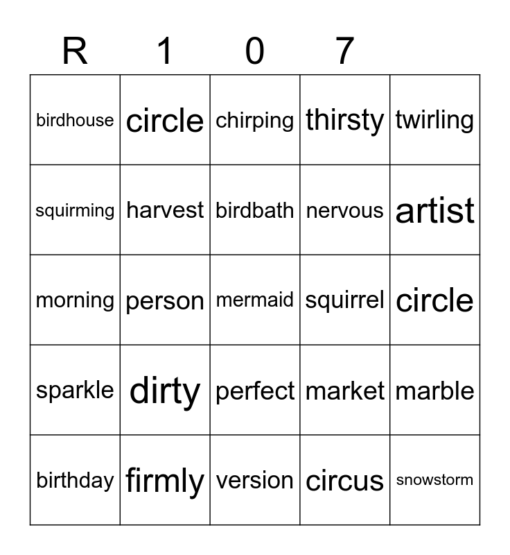 This bingo card has a free space and 24 words: dirty, firmly, birdbath, birthday, twirling, birdhouse, squirming, circle, squirrel, perfect, nervous, morning, market, marble, harvest, circus, circle, chirping, artist, person, snowstorm, sparkle, thirsty and version.