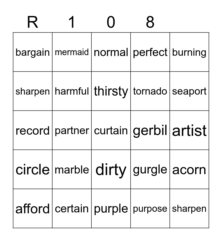 This bingo card has a free space and 24 words: marble, certain, thirsty, afford, burning, bargain, sharpen, mermaid, gerbil, dirty, tornado, record, gurgle, acorn, harmful, purpose, artist, normal, seaport, partner, sharpen, circle, perfect and purple.