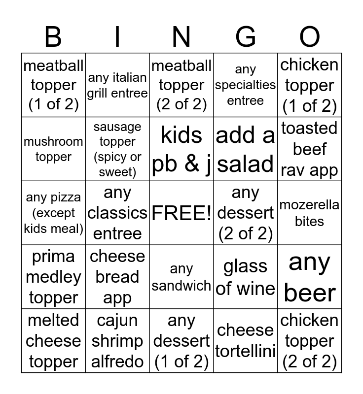 This bingo card has a free space and 24 words: cheese bread app, cajun shrimp alfredo, kids pb & j, melted cheese topper, chicken topper (1 of 2), meatball topper (1 of 2), mushroom topper, any italian grill entree, any dessert (2 of 2), any sandwich, add a salad, any pizza (except kids meal), glass of wine, any beer, sausage topper (spicy or sweet), cheese tortellini, mozerella bites, meatball topper (2 of 2), toasted beef rav app, any classics entree, chicken topper (2 of 2), prima medley topper, any specialties entree and any dessert (1 of 2).