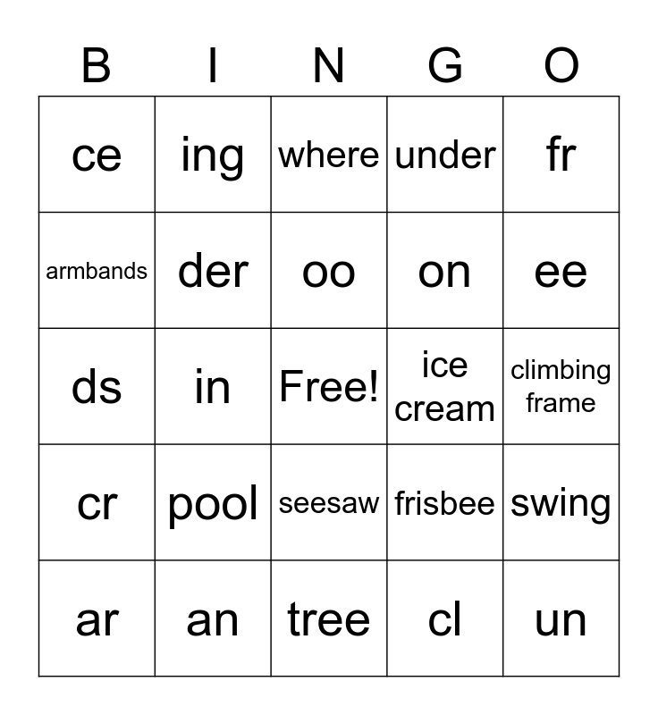 This bingo card has a free space and 24 words: pool, an, oo, ar, fr, ce, armbands, ing, ice cream, seesaw, on, ds, frisbee, swing, der, cl, climbing frame, where, ee, in, un, cr, under and tree.