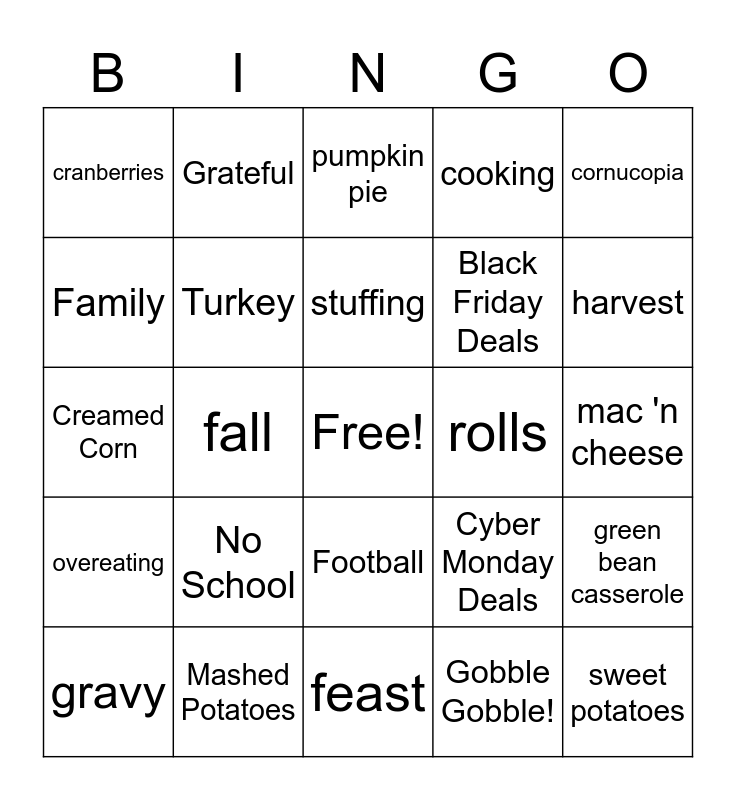 This bingo card has a free space and 24 words: No School, Mashed Potatoes, stuffing, gravy, cornucopia, cranberries, Family, Grateful, rolls, Football, Black Friday Deals, Creamed Corn, Cyber Monday Deals, green bean casserole, Turkey, Gobble Gobble!, mac 'n cheese, pumpkin pie, harvest, fall, sweet potatoes, overeating, cooking and feast.