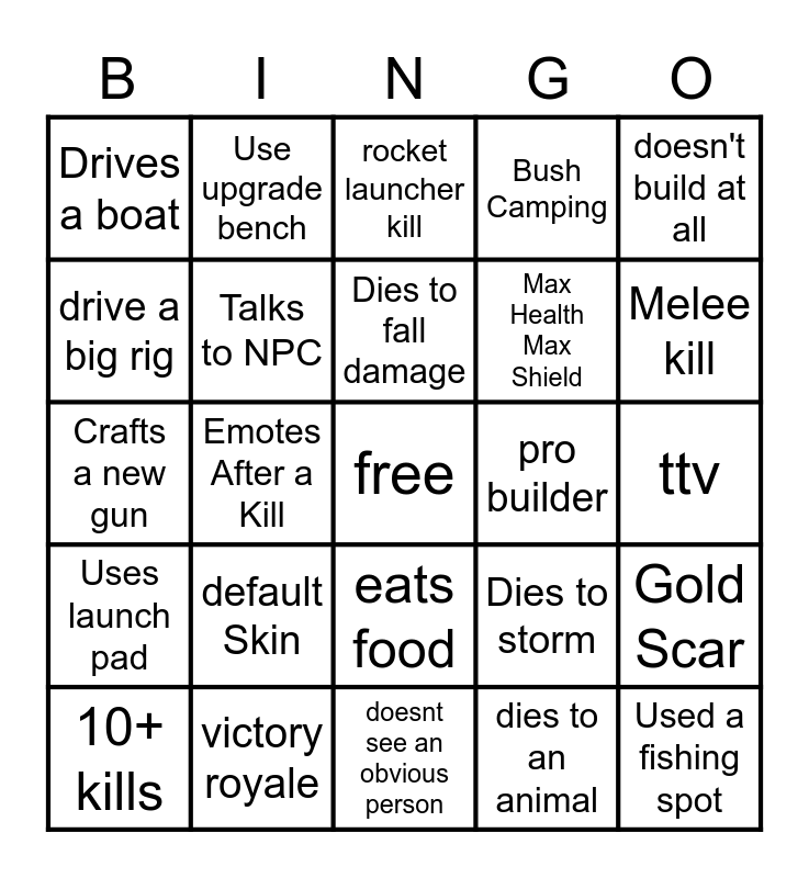 This bingo card has a free space and 25 words: default Skin, doesnt see an obvious person, Dies to fall damage, 10+ kills, doesn't build at all, Drives a boat, drive a big rig, Use upgrade bench, pro builder, eats food, Max Health Max Shield, Crafts a new gun, Dies to storm, Gold Scar, Talks to NPC, Bot, ttv, rocket launcher kill, Melee kill, Emotes After a Kill, Used a fishing spot, victory royale, Uses launch pad, Bush Camping and dies to an animal.