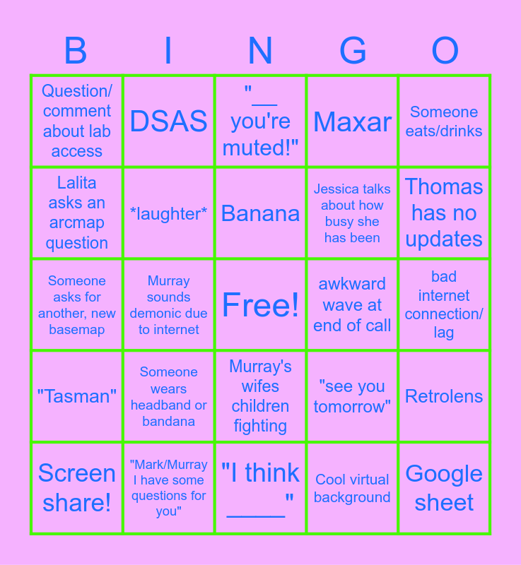 This bingo card has a free space and 29 words: Screen share!, Marks dog jumps up, Murray sounds demonic due to internet, "package", Question/ comment about lab access, "__ you're muted!", *laughter*, Someone wears headband or bandana, awkward wave at end of call, "Mark/Murray I have some questions for you", bad internet connection/ lag, Google sheet, "I think ____", Cool virtual background, Thomas has no updates, Geocomp lab computer updates, Murray's wifes children fighting, "Tasman", Someone eats/drinks, Someone asks for another, new basemap, "see you tomorrow", Yawn, Jessica talks about how busy she has been, Lalita asks an arcmap question, Maxar, DSAS, Retrolens, Banana and Slack.