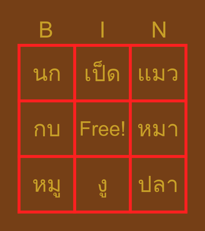 This bingo card has a free space and 8 words: หมา, แมว, เป็ด, หมู, นก, ปลา, กบ and งู.