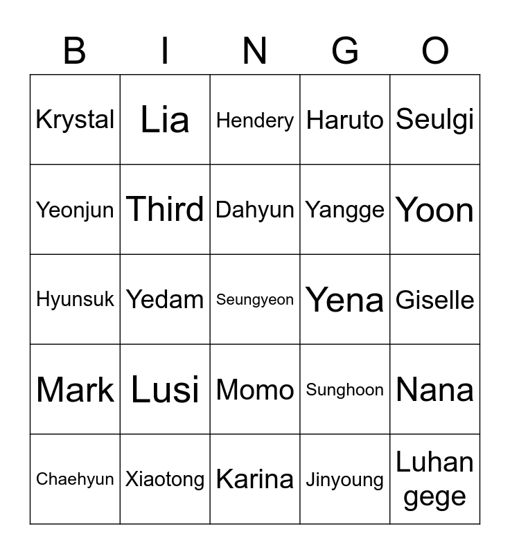 This bingo card has 25 words: Lusi, Karina, Dahyun, Chaehyun, Seulgi, Krystal, Yeonjun, Lia, Yena, Momo, Yangge, Hyunsuk, Sunghoon, Nana, Third, Luhan gege, Giselle, Hendery, Yoon, Yedam, Seungyeon, Xiaotong, Mark, Haruto and Jinyoung.