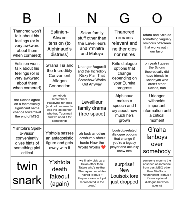 This bingo card has a free space and 24 words: Y’shtola sasses an antagonistic figure and gets away with it, Y’shtola death fakeout (again), Urianger Augurelt and the Incredibly Risky Plan That Somehow Works Out Anyway, twin snark, Tataru and Krile do something vaguely ominous offscreen that works out in our favor, Thancred won’t talk about his feelings (or is very awkward about them when cornered), Estinien won’t talk about his feelings (or is very awkward about them when cornered), Estinien-Alisaie tension (to Alphinaud’s distress), Alphinaud makes a speech and I cry about how much he’s grown, oh look another loredump about basic How the World Works ❤️, Krile dialogue options that change depending on your Eureka progress, the Scions agree on a thematically significant name change towards/at the end of MSQ, Louisoix-related dialogue options that change if you’re a legacy player and actually knew him, G’raha fanboys over somebody, G’raha Tia and the Incredibly Convenient Allagan Connection, surprise! New Louisoix lore just dropped, Urianger withholds important information until a critical moment, Scion family stuff other than the Leveilleurs and Y’mhitra and Matoya, oh yeah I guess the Scions theoretically did have friends in Sharlayan who aren’t other Scions, huh, somebody remembers Papalymo for once (and not because he was the last person who had Tupsimati and we need it for something), someone mourns the absence of someone from past MSQ other than Minfilia or Haurchefant (bonus if it’s not optional dialogue between quests), Y’shtola’s Spell-o-Vision conveniently gives hints of something plot critical, Thancred remains relevant and neither dies nor retires and we finally pick up a Scion other than Tataru who’s neither Sharlayan nor white-haired (bonus if they’re a race not yet represented in the group).