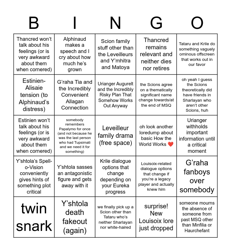 This bingo card has a free space and 24 words: Y’shtola sasses an antagonistic figure and gets away with it, Y’shtola death fakeout (again), Urianger Augurelt and the Incredibly Risky Plan That Somehow Works Out Anyway, twin snark, Tataru and Krile do something vaguely ominous offscreen that works out in our favor, Thancred won’t talk about his feelings (or is very awkward about them when cornered), Estinien-Alisaie tension (to Alphinaud’s distress), Alphinaud makes a speech and I cry about how much he’s grown, oh look another loredump about basic How the World Works ❤️, Krile dialogue options that change depending on your Eureka progress, the Scions agree on a thematically significant name change towards/at the end of MSQ, Estinien won’t talk about his feelings (or is very awkward about them when cornered), Louisoix-related dialogue options that change if you’re a legacy player and actually knew him, G’raha fanboys over somebody, G’raha Tia and the Incredibly Convenient Allagan Connection, surprise! New Louisoix lore just dropped, Urianger withholds important information until a critical moment, Scion family stuff other than the Leveilleurs and Y’mhitra and Matoya, oh yeah I guess the Scions theoretically did have friends in Sharlayan who aren’t other Scions, huh, somebody remembers Papalymo for once (and not because he was the last person who had Tupsimati and we need it for something), someone mourns the absence of someone from past MSQ other than Minfilia or Haurchefant, Y’shtola’s Spell-o-Vision conveniently gives hints of something plot critical, Thancred remains relevant and neither dies nor retires and we finally pick up a Scion other than Tataru who’s neither Sharlayan nor white-haired.