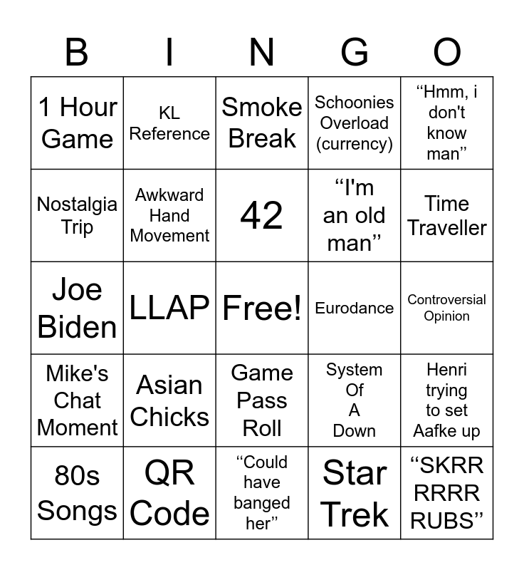 This bingo card has a free space and 24 words: 80s Songs, Asian Chicks, 42, Star Trek, ‘‘Hmm, i don't know man’’, 1 Hour Game, KL Reference, Smoke Break, Eurodance, Controversial Opinion, Joe Biden, Awkward Hand Movement, System Of A Down, Henri trying to set Aafke up, Nostalgia Trip, QR Code, ‘‘Could have banged her’’, Schoonies Overload (currency), Time Traveller, Mike's Chat Moment, LLAP, Game Pass Roll, ‘‘I'm an old man’’ and ‘‘SKRR RRRR RUBS’’.