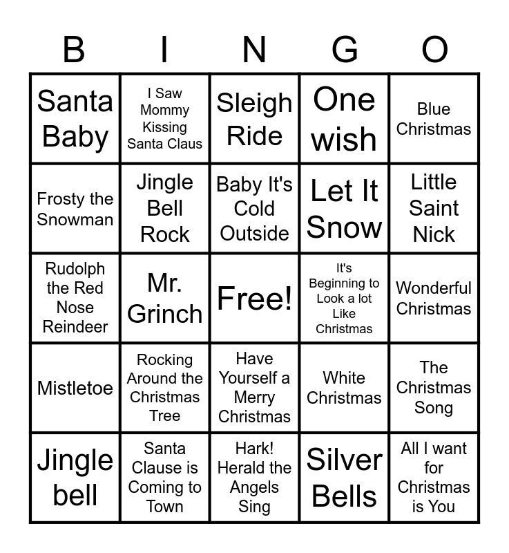 This bingo card has a free space and 24 words: Rocking Around the Christmas Tree, Santa Clause is Coming to Town, Baby It's Cold Outside, Jingle bell, Blue Christmas, Santa Baby, Frosty the Snowman, I Saw Mommy Kissing Santa Claus, It's Beginning to Look a lot Like Christmas, Have Yourself a Merry Christmas, Let It Snow, Rudolph the Red Nose Reindeer, White Christmas, The Christmas Song, Jingle Bell Rock, Silver Bells, Wonderful Christmas, Sleigh Ride, Little Saint Nick, Mr. Grinch, All I want for Christmas is You, Mistletoe, One wish and Hark! Herald the Angels Sing.